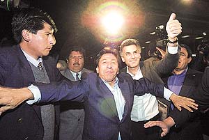 페루 원주만 출신으로 지난 대선에 후보로 나선 알레한드로 톨레도 후보(왼쪽)가 유세도중 장미에 입맞춤을 하고 있다. 오른쪽은 부인 엘리안 카프
