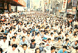정부는 지난 4일 국무회의에서 민주화운동보상법 시행령을 확정하면서 그 대상자 범위선정을 놓고 논란이 일고 있다. 좌측 사진은 87년 6월 항쟁-① 서울명동에서 학생들과 시민 2천여명이 연좌시위를 벌이고 있다.