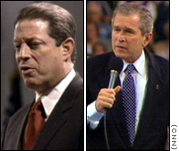 최근 워싱턴포스트의 조사에서는 부시49%, 고어45%이지만, 그러나 경합주인 플로리다(선거인단수 25명), 펜실베이니아(23), 미시건(18), 위스콘신(11)에서 고어가 여론조사에서 우세하다. 앨 고어 부통령의 바램은 승리를 위해서는 과반수인 270명의 선거인단수 확보를 위해 가장 중요한 주에 시간과 돈을 집중적으로 투자하겠다는 것이다. 반면 부시는 캘리포니아와 같은 민주당 우세지역에서의 선거운동과, 고어가 일찌감치 포기한 다른 지역에서 큰 격차로 승리하겠다는 전략으로 에너지를 쏟았다.