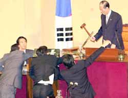 JP와 이한동이 여유롭게 웃고 있는 그 시간 국회의사당은 여야의원들의 난투극으로 난장판이 되고 있었다.