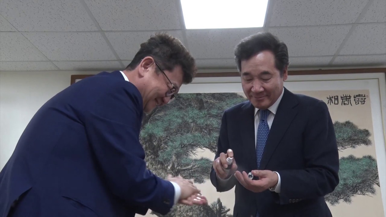 24일 이낙연, 코로나19재난안전대책위원회 위원장이 ‘폴리뉴스’ 김능구 대표와의 ‘정국진단’ 인터뷰에 앞서 손소독제를 뿌려주고 있다.