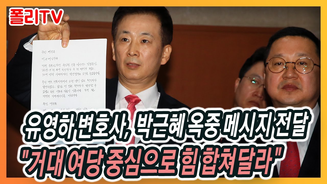관련기사 유영하, 박근혜 옥중 성명문 발표…“오랫동안 다듬은 메시지” [포토] 박근혜 친필 옥중 편지 공개 [전문] 총선 앞두고 '박근혜 친필 옥중편지' “기존 거대 보수야당 중심으로 태극기 힘 합쳐 달라” [이슈] 신천지 이만희, 박근혜 시계 왜 차고 나왔나?...초미의 관심사로