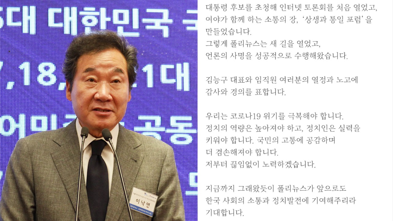이낙연 민주당 코로나19국난극복위원장은 이날 20주년 창간을 축하하기 위해 축사를 보내 “지난 20년간 폴리뉴스는 도전을 거듭해왔다”고 평가했다.