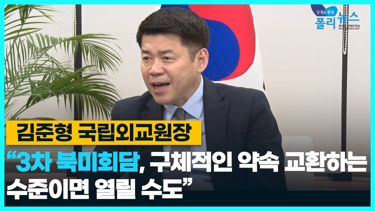 김준형 국립외교원장은 23일 국립외교원에서 폴리뉴스 김능구 대표와 진행한 인터뷰에서, 3차 북미 정상회담이 어렵기는 하지만 “실천보다 구체적인 약속을 교환하는 방식으로 열릴 수도 있다”고 말하고, 한반도 평화를 위한 노력은 “2017년으로 돌아가지 않는 것이 첫번째 목표”라고 강조했다.
