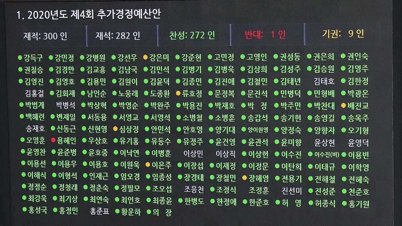 국회는 22일 저녁 10시 본회의에서 신종 코로나바이러스 감염증(코로나19) 재확산으로 피해를 본 계층을 맞춤형 지원하는 7조8천147억원의 4차 추경안을 처리했다. 재석 282명중 찬성 272명, 반대 1명, 기권 9명이었다. [영상 제공 : NATV 국회방송]