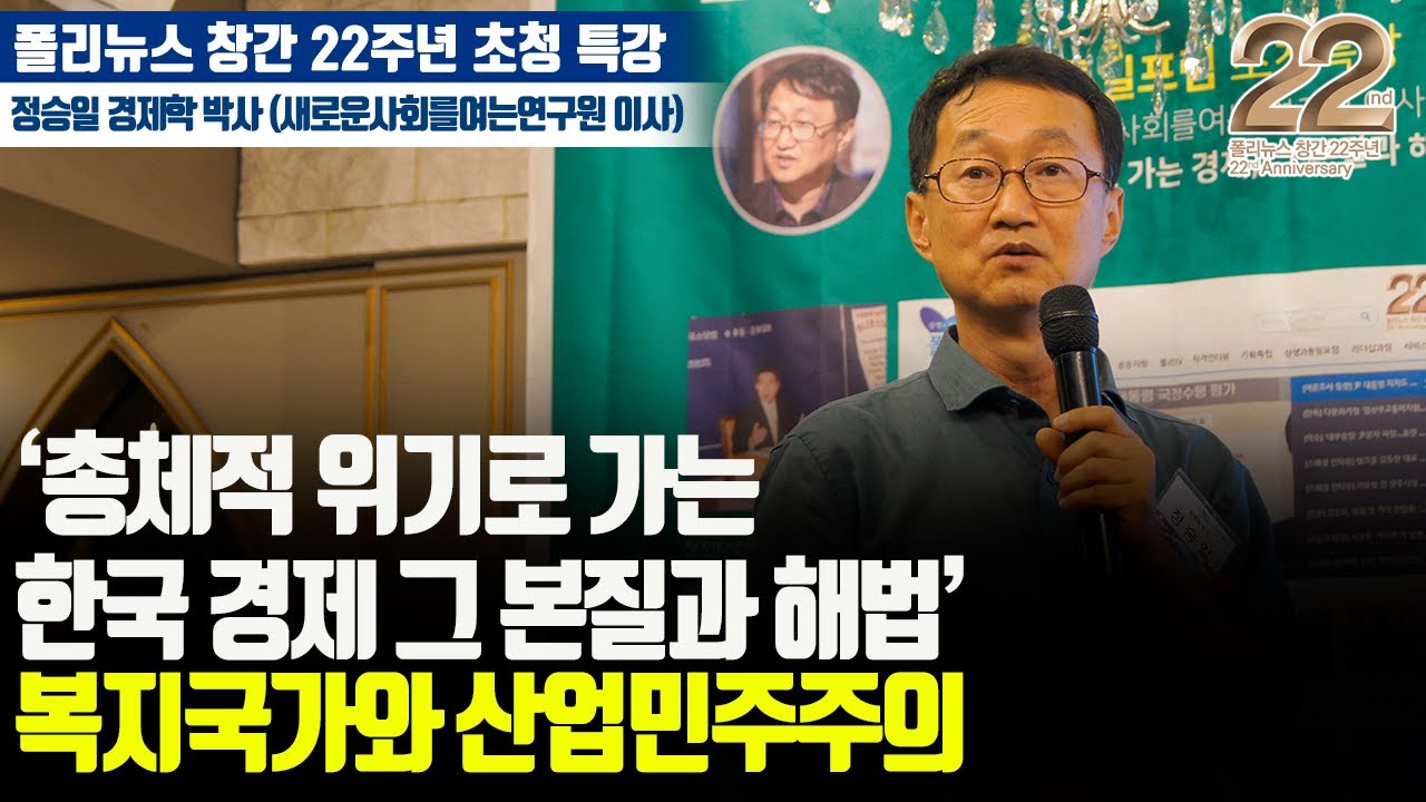 정승일 새로운사회를여는연구원 이사(경제학 박사)는 24일 서울 여의도 CCMM빌딩(국민일보) 12층에서 열린 <폴리뉴스 창간 22주년 기념 상생과통일포럼 초청특강>에서, 총체적 위기로 가는 한국경제의 해법으로 ‘복지국가와 산업민주주의’를 제시했다.