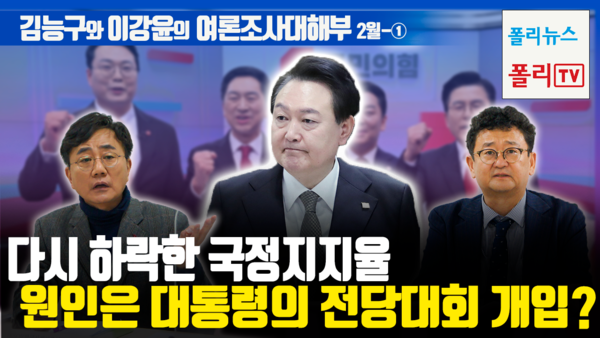 - [폴리TV][김능구와 이강윤의 여론조사 대해부 2월 ①] “다시 하락한 국정지지율, 원인은 대통령의 전당대회 개입”