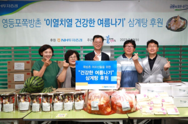 이날 NH투자증권은 삼계탕 500인분과 김치 400㎏, 수박, 떡 등을 전달했다. 전달식에는 배부열 NH투자증권 부사장과 광야교회 홈리스센터의 정경화 센터장, 사단법인 사막에 길을내는사람들의 최은화 사무국장, 김형옥 영등포 쪽방 상담소 소장 등이 참석했다.
