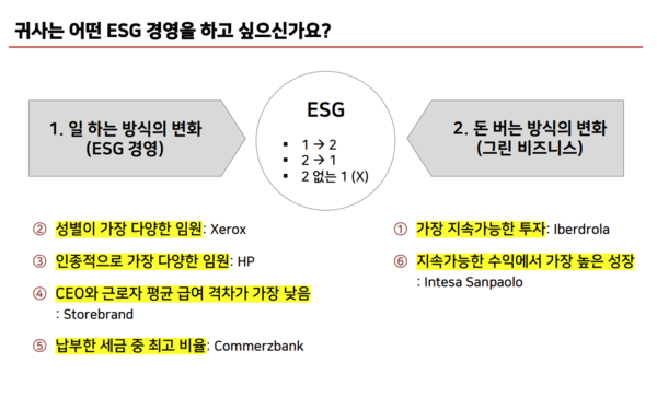 세계 10대 ESG 기업의 그린 비즈니스에 따르면 녹색 매출 비중 89%, 녹색 투자 비중 86%를 보이고 있는 만큼 그린 비즈니스에서 승부가 갈리고 있다.