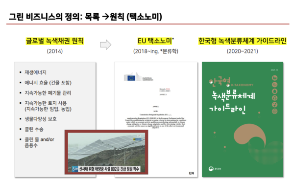 2018년부터 지금까지 어떠한 정의를 분류하고자 EU 택소노미를 만들게 된다. 이후 2021년 12월에 한국형 녹색분류체계 가이드라인을 수립한다.