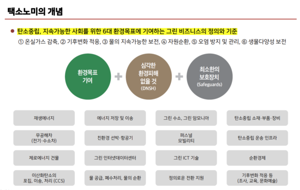 택소노미에는 6대 정의가 있다. ▲온실가스 감축 ▲기후변화 적응 ▲물의 지속가능한 보전 ▲자원순환 ▲오염 방지 및 관리 ▲생물다양성 보전 이다.