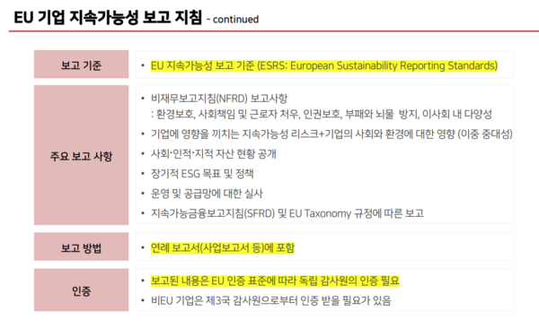 아울러 2024년부터 단계적으로 적용될 예정인 CSRD가 있겠다. CSRD 적용을 받는 기업은 EU 기반 모든 기업의 75% 수준으로, 이들은 ESRS에 따라 공시 의무를 이행해야 한다.