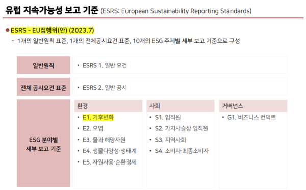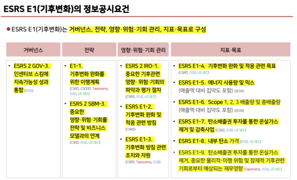 ESRS E1(기후변화)의 정보공시 요건으로는 거버넌스, 전략, 영향·위험·기회 관리, 지표·목표로 구성된다. 기후관련 정보에 대한 사용자 니즈는 기업의 물리적·이행 리스크, 2050 탄소중립 목표에 적응하기 위한 다양한 기후시나리오에 따른 기업의 계획과 회복탄력성에 대한 것이다.
