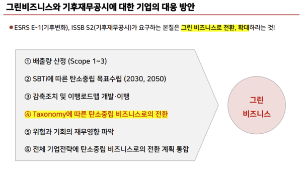 그린 비즈니스와 기후재무공시에 대한 기업의 대응 본질은 택소노미에 따른 탄소중립 비즈니스로의 전환이 가장 중요하다.
