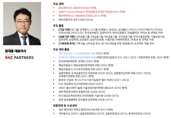 임대웅 대표는 한국항공대학교 경영학 학사, 대학원 경영학 석사를 마치고 에든버러대학교 대학원 Environmental Sustainability 석사 학위를 취득했다. 이후 유엔 글로벌콤팩트 운영위원, 녹색성장위원회 전문위원, 에코프론티어 상무, 에코앤파트너스 대표 파트너 등을 역임했으며, 현재 에코앤파트너스 대표 파트너 및 울산과학기술원 UNIST 기술경영전문대학원 산업계 겸임교수로 재직 중에 있다.