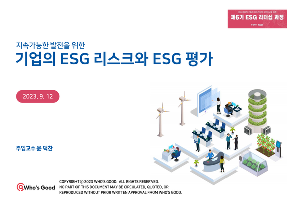 본 기사는 지난 9월 12일에 열린 ‘제6기 매경·환경재단 ESG 리더십 과정’ 3주차 과정에서 지속가능발전소 윤덕찬 대표의 기조강연 ‘지속가능한 발전을 위한 기업의 ESG 리스크와 ESG 평가’의 내용을 토대로 다루고 있다.