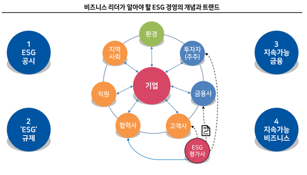 ESG 경영은 사회에 미치는 전반적인 영향, 즉 긍정적 기여 극대화 및 부정적 영향을 최소화하는 경영이다. ESG 평가는 기업 활동의 정당성이 제공하는 이해관계자와의 상호 의존적 관계의 중요성을 평가하는 것이다.