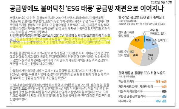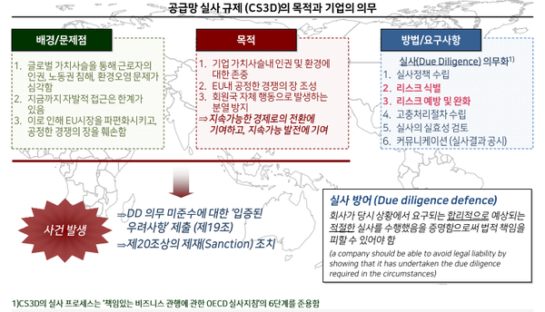 국내 수출기업의 가장 큰 고민은 EU 공급망실사규제(CS3D)다. 향후 유럽 수출을 위해서는 반드시 공급망 내 협력업체의 ESG 리스크를 식별하고 관리해야 한다.