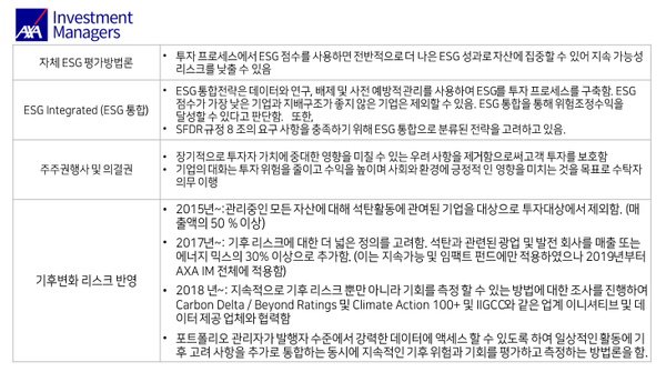 Axa 자산운용은 전 자산군에 ESG 통합을 적용하고 있으며, 2015년부터 기후위험에 대한 위험과 기회를 식별하고 투자전략에 반영하고 있다.