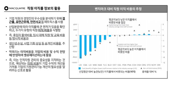 맥쿼리증권은 Social 가치 측면에서 직원과 경영진의 우수성을 분석해 ‘직원 이직비용’을 추정한다. 기업의 비용전망과 수익전망에 직접 투입하여 밸류에이션에 반영한다.
