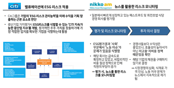 CITI그룹은 광산기업 가치평가에 ESG리스크를 식별하는 지수를 개발하여 활용한다. Nikko 자산운용은 ESG 평가를 활용하고, 뉴스를 통해 ESG 사건사고를 반영해 투자 의사결정에 활용한다.