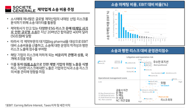 Societe Generale은 제약산업에서 큰 Social 리스크인 소송리스크를 ‘소송데이터’를 활용하여 운영점수와 평판리스크를 분석하고 소송비용을 추정한다.