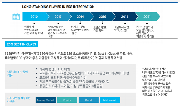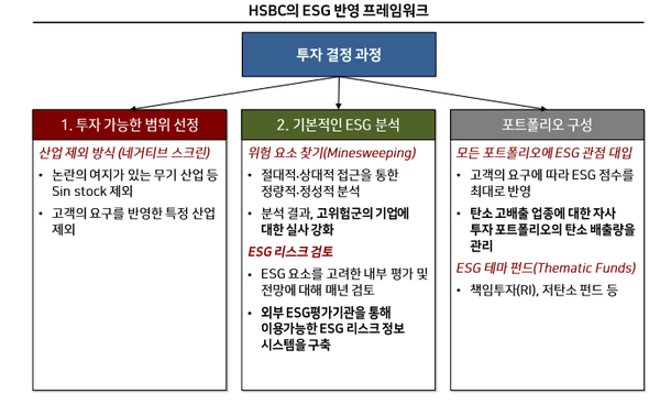 Amundi 자산운용의 경우 좋은 등급을 받은 기업에 투자하는 ‘Best in Class’ 전략을 주로 사용하며, HSBC 글로벌 자산운용은 모든 투자 과정에서 ESG를 반영해 ESG 공시가 불충분할 경우 직접 기업에 정보를 요구하여 투자에 반영한다.
