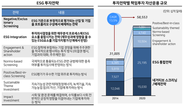 ESG통합전략을 따르는 펀드 자산 규모가 빠르게 증가하고 있다. 펀더멘털 투자자는 ESG 항목을 활용해 재무평가지표와 기업가치평가모델을 조정하고 퀀트 투자자는 가치, 사이즈, 모멘텀, 성장성에 ESG 요소를 통합해서 투자에 활용하고 있다.