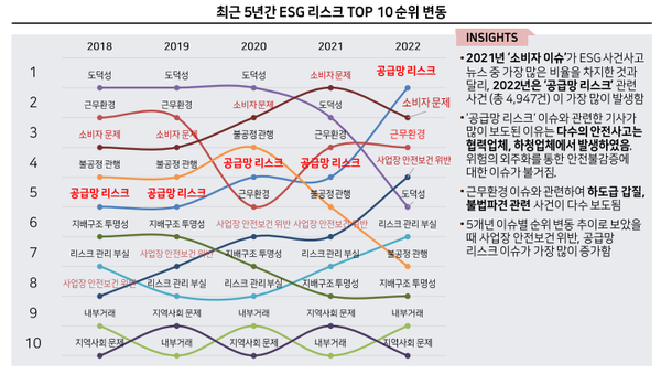 작년은 소셜 이슈가 더욱 두드러진 한 해로, ESG에서 가장 많이 나온 이슈는 사상 처음 ‘공급망 리스크’, ‘사업장 안전보건’ 문제도 최근 5년 사이에 가파르게 급증하고 있는 이슈다.