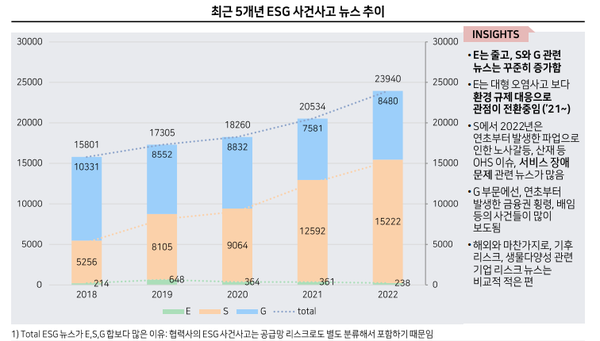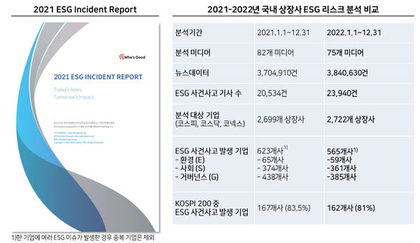2022년 ESG 사건사고 발생 상장사는 총 565개사(20.7%)로 2015년부터 분석한 이후 8년만에 처음으로 전년도에 비해 ESG 사건사고 발생기업이 감소했다. 이는 중대재해처벌법, 공급망실사규제, ESG경영 등으로 인한 관리 노력의 영향으로 해석된다.