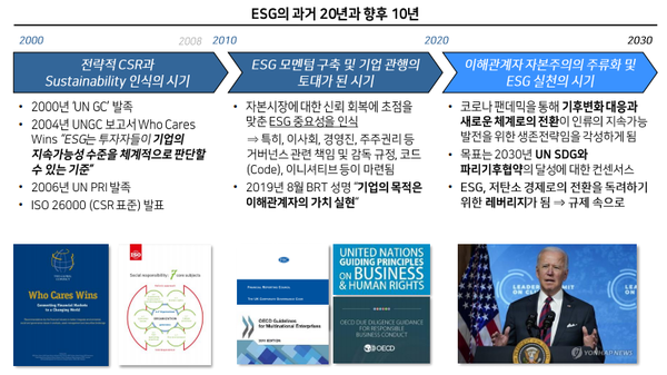 지난 20년간 ESG는 두 번의 변화를 겪으며 3가지 역할을 하게 되었다. 우리 사회의 근본적인 문제 해결을 다루는 것으로 시작해 기업의 자본을 늘리는 기회 요인과 저탄소 경제사회로의 전환을 촉진하게 위한 수단으로 바뀌게 됐다.