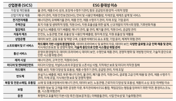 산업별/업종별로 중요한 ESG 이슈는 상이하지만 대부분의 업종에서 ‘에너지 관리’는 중대성 이슈에 반드시 포함되며, 제조업의 온실가스 배출량 감축 전략 또는 기후 리스크 관리 전략은 중요 평가 대상이다.