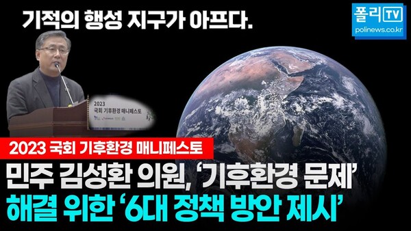 더불어민주당 김성환 의원(서울 노원구병)은 9일 폴리뉴스(대표 김능구), 상생과통일포럼(공동대표 정우택·김영주 국회부의장), 환경재단(이사장 최열) 공동주최로 국회의원회관 대회의실에서 열린 ‘2023 국회 기후환경 매니페스토’ 발제를 통해 2050년까지 탄소중립을 달성하기 위해 에너지, 산업, 수송, 건물, 농축산 등 5개 분야의 6대 핵심 정책·입법 과제를 제시했다.