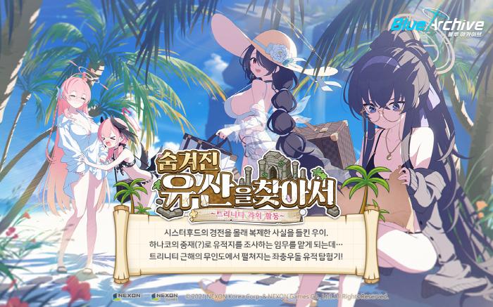 이번 이벤트 스토리에서는 ‘트리니티 종합학원’ 소속 학생들이 주인공으로 등장하며, 무인도에서 유적지를 조사하는 임무를 맡은 ‘우이’와 학생들에 대한 이야기를 확인할 수 있다. 이벤트 스토리를 진행하면 이벤트 포인트가 주어지며, 이를 활용해 ‘크레딧 포인트’, ‘코하루(수영복)’의 엘레프’ 등 각종 보상을 얻을 수 있다. 이 외 ‘대성당 비밀의 방 정문’ 스토리를 완료하면 ‘코하루(수영복)’을 획득할 수 있다.