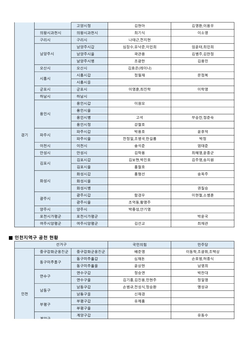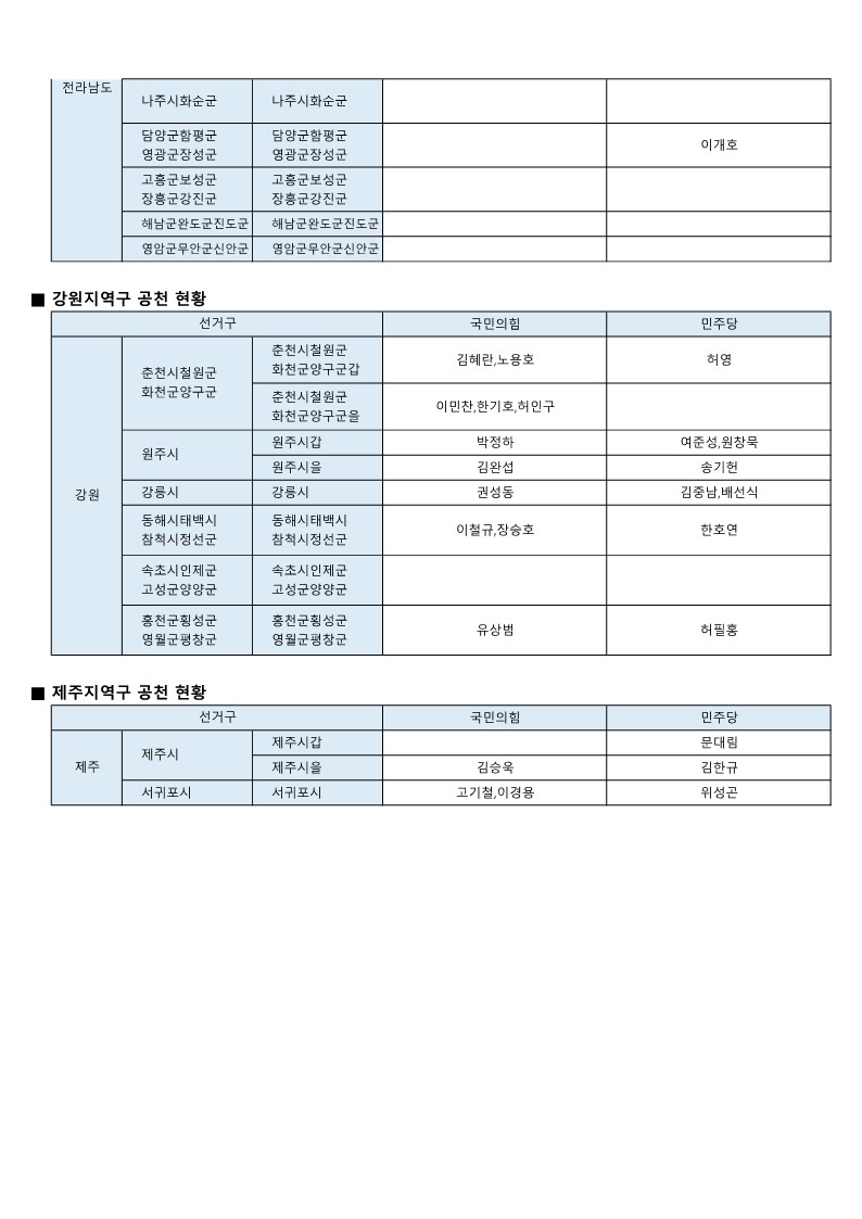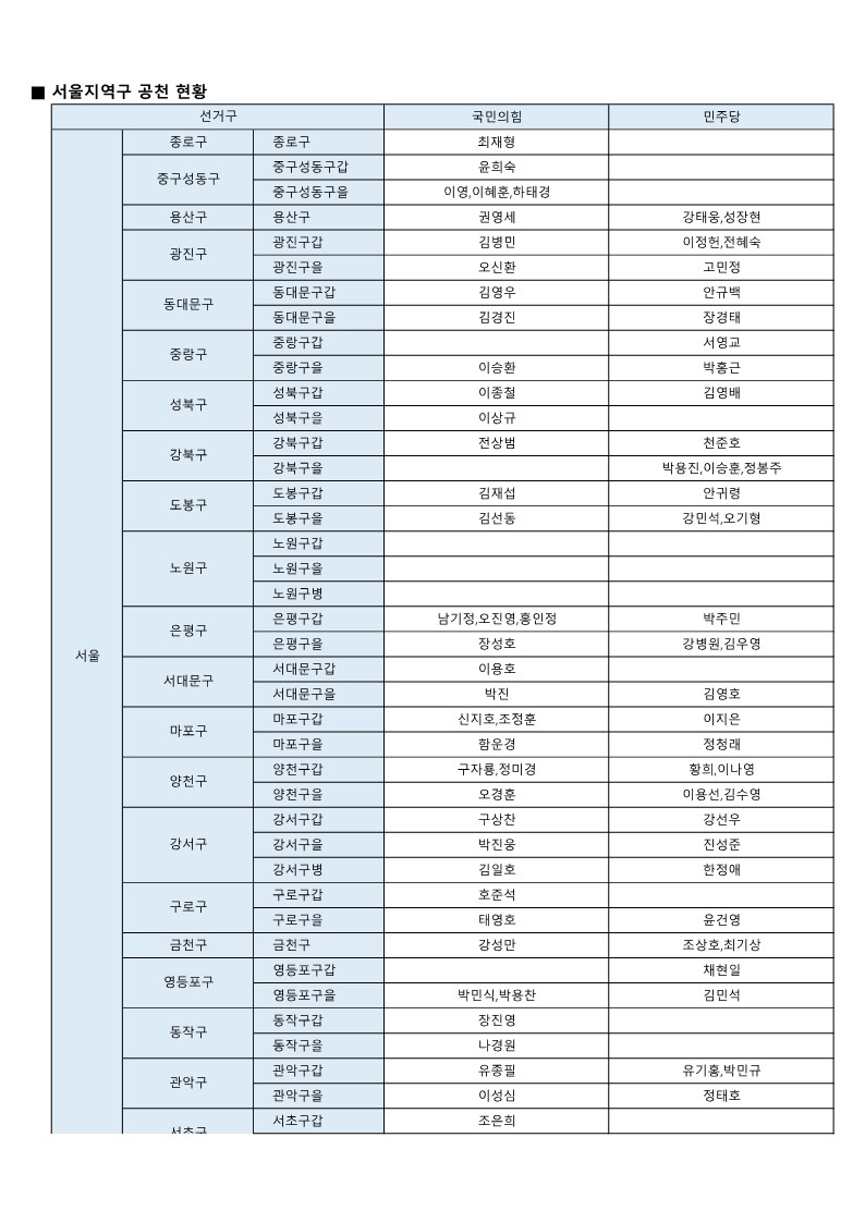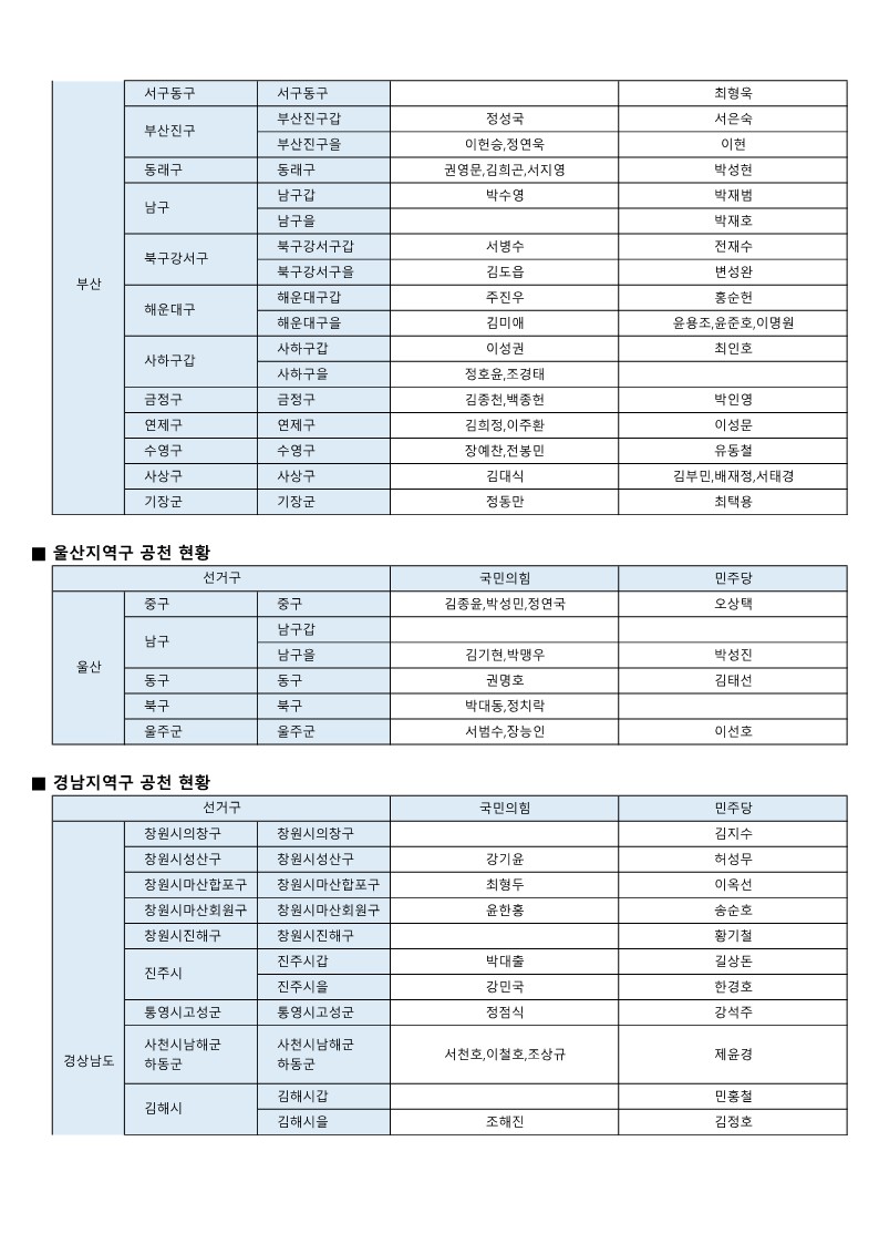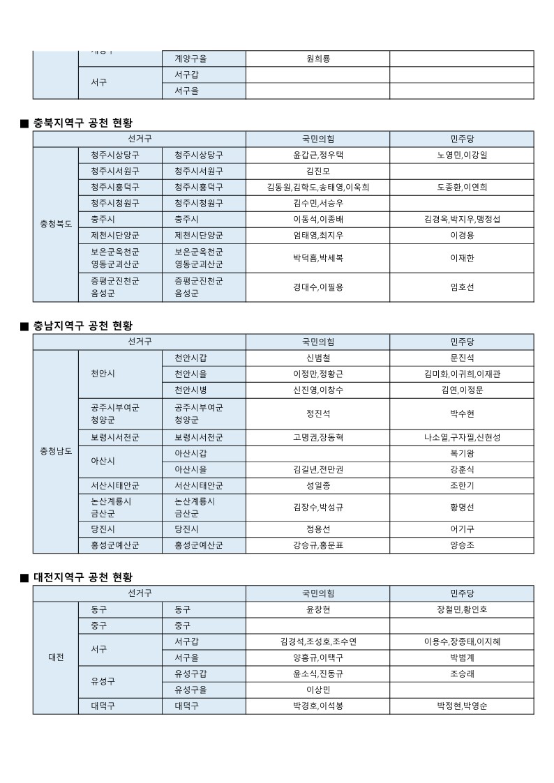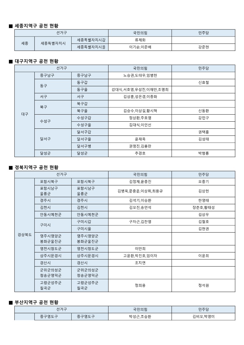 - [22대 총선] 국민의힘-더불어민주당 공천 발표 모음(~3월 7일 현재)
