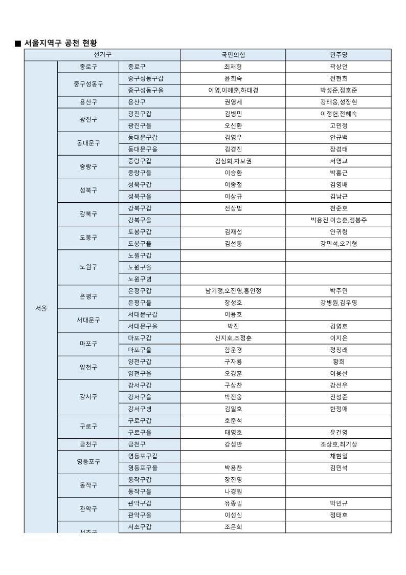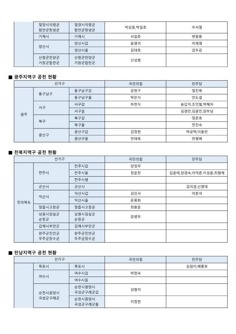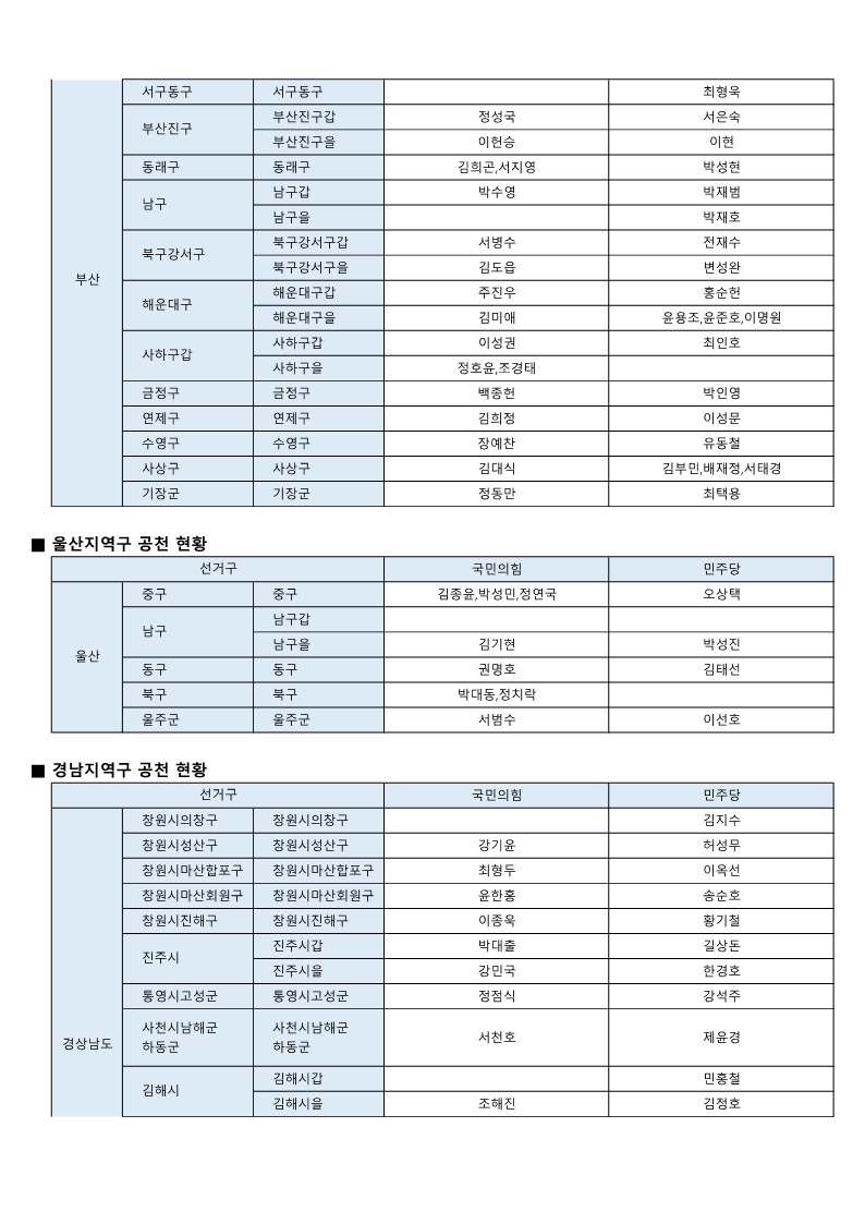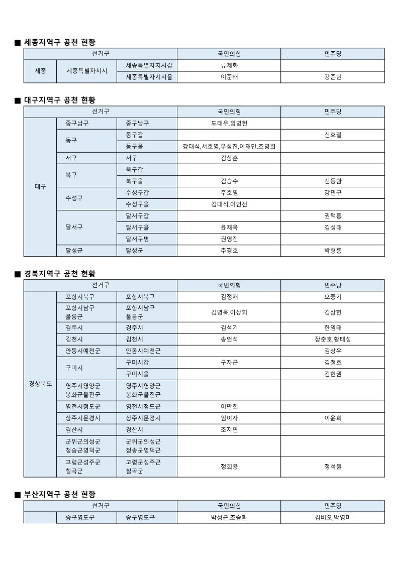 - [22대 총선] 국민의힘-더불어민주당 공천 발표 모음(~3월 7일 현재)