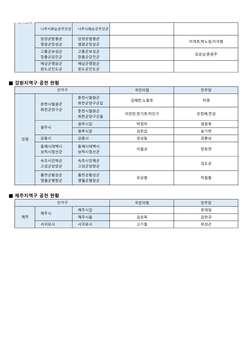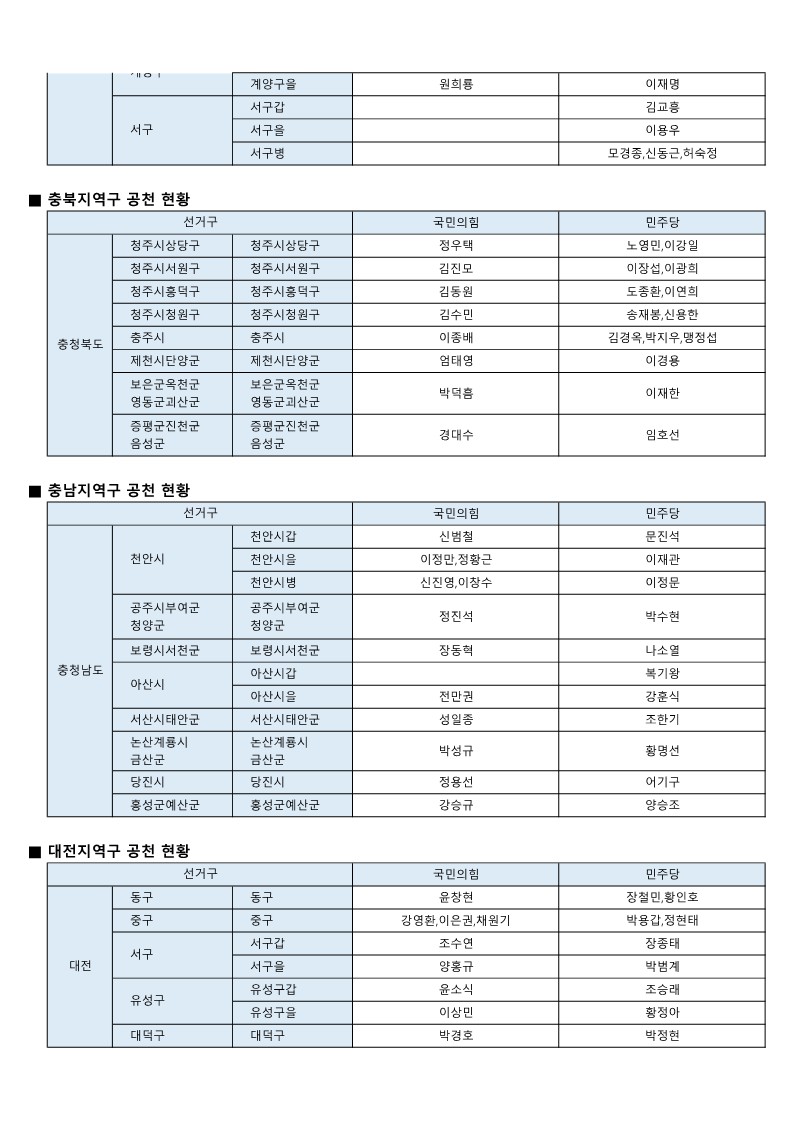 선거구 확정안에 따라 조정한 내용이다. (서울-1/인천+1/경기 분구+3,통합-2/전북-1/전남 분구+1,통합-1/부산 분구+1,통합-1) 국민의힘은 지금까지 공천발표율 77.2%로 196개를 발표했으며, 민주당은 89.0%로 226개의 공천발표 현황을 보였다. 선거구에 복수기재는 경선지역이다. 이제 양당 공천이 막바지에 접어들고 있다.