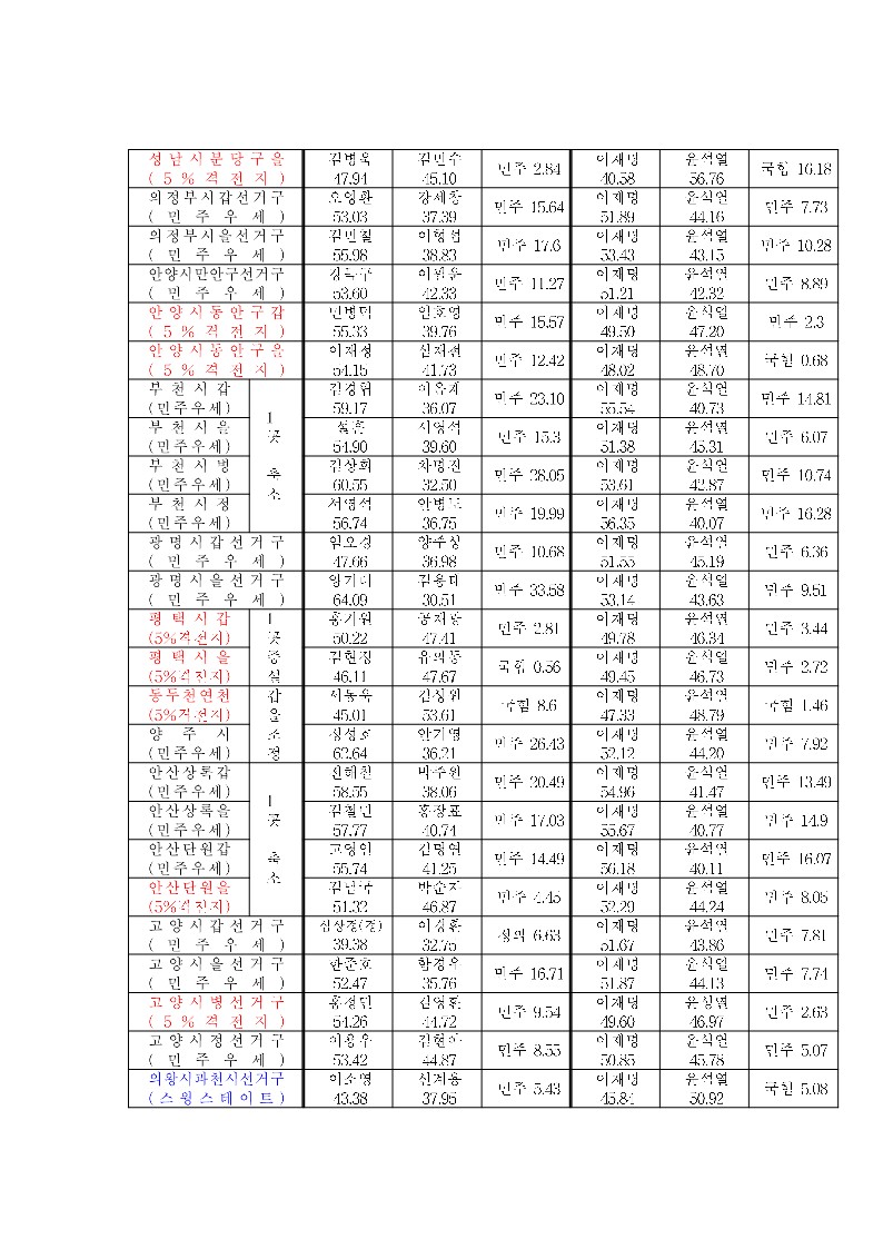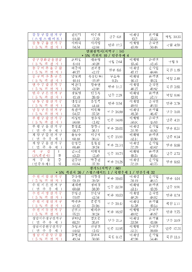 서울은 한강벨트, 경기는 반도체벨트, 인천은 부평, 계양, 서구를 제외하곤 5% 격전지에 속한다.