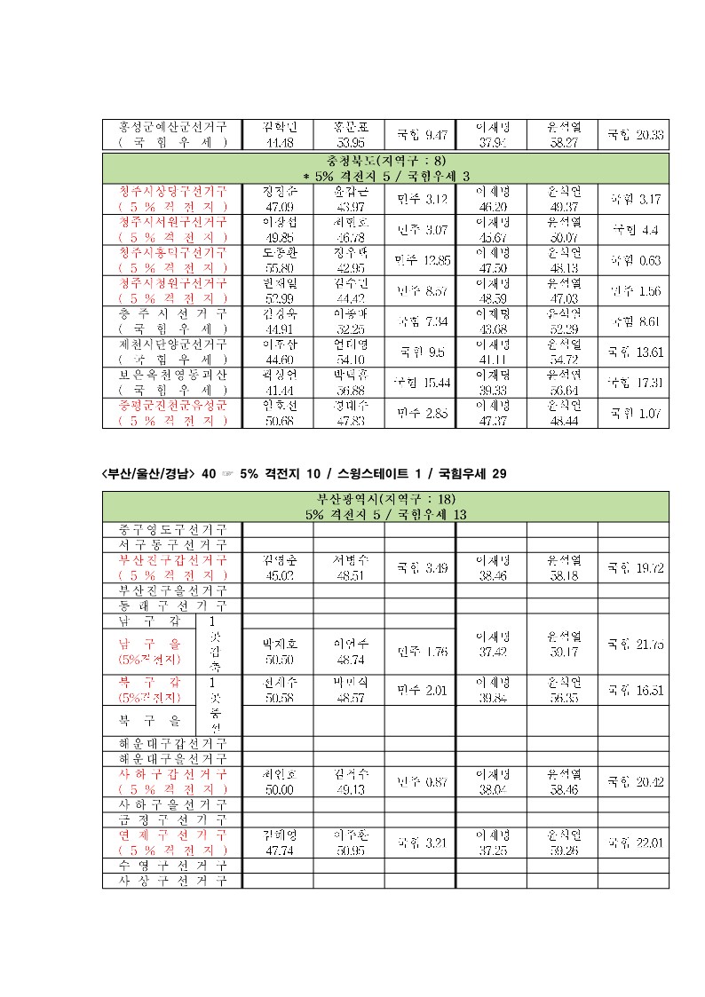5%p 격전지가 수도권, 충청권, PK권에 많이 분포되어 있다, 5% 격전지가 수도권은 전체 122개 지역구 의석 중 64개, 충청은 28개에서 60%가 넘는 18개, PK는 40개의 25%인 10개가 5% 격전지였다.