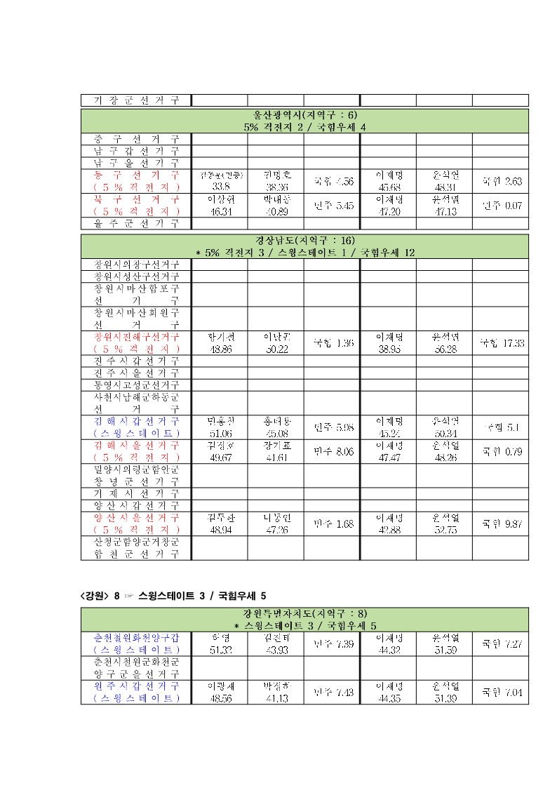 강원, TK, 호남, 제주는 5%p 격전지가 없다. 스윙 스테이지가 강원도에 세곳 정도 있다. 강원과 TK는 국힘이 우세하고, 호남과 제주는 민주당 우세 지역으로 나타나고 있다.