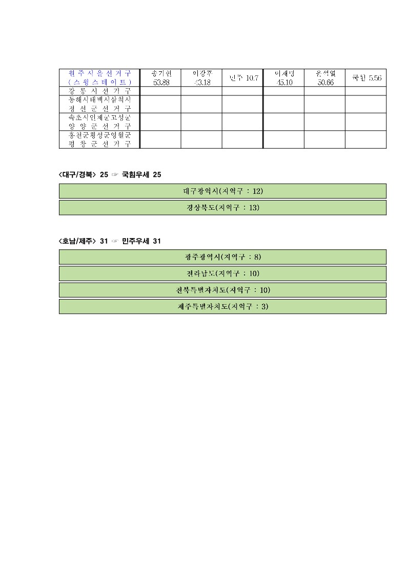경기도는 민주 우세 지역이 과반, 60개 중에서 32개다. 민주당이 가장 자신하는 지역이 경기도다. 경기도에서 전체 지역구 60개 중 우세 지역이 32개가 된다.
