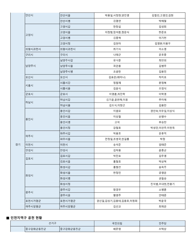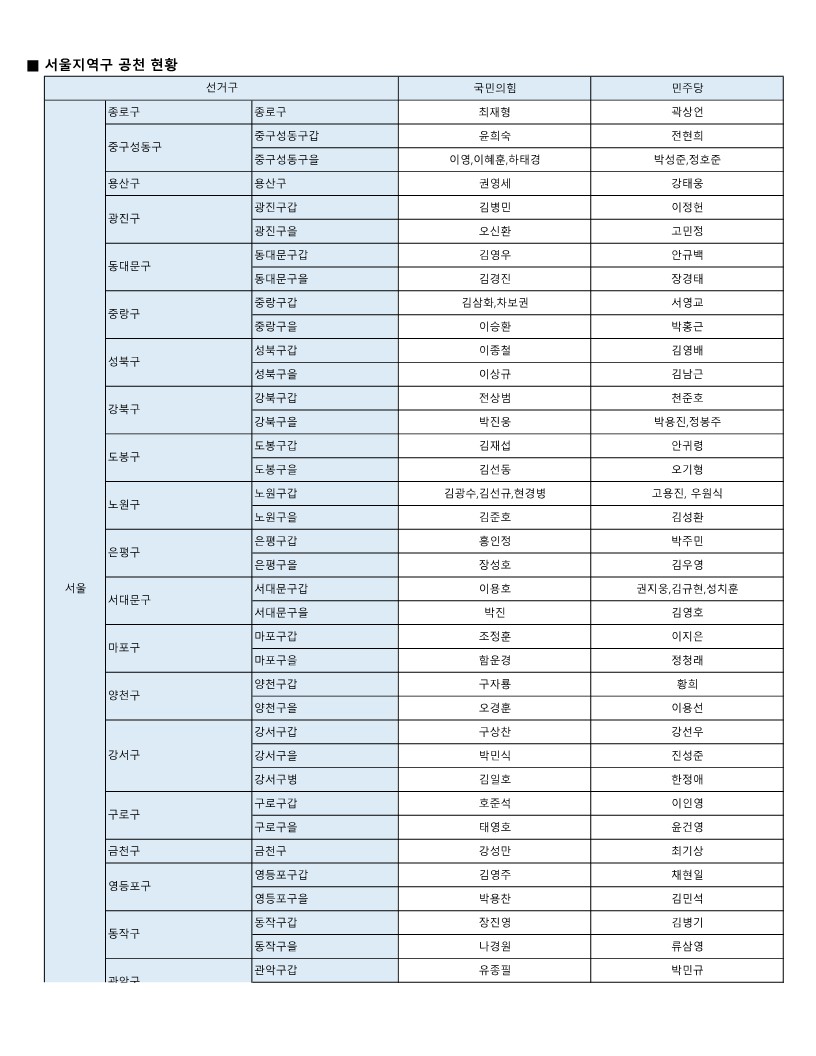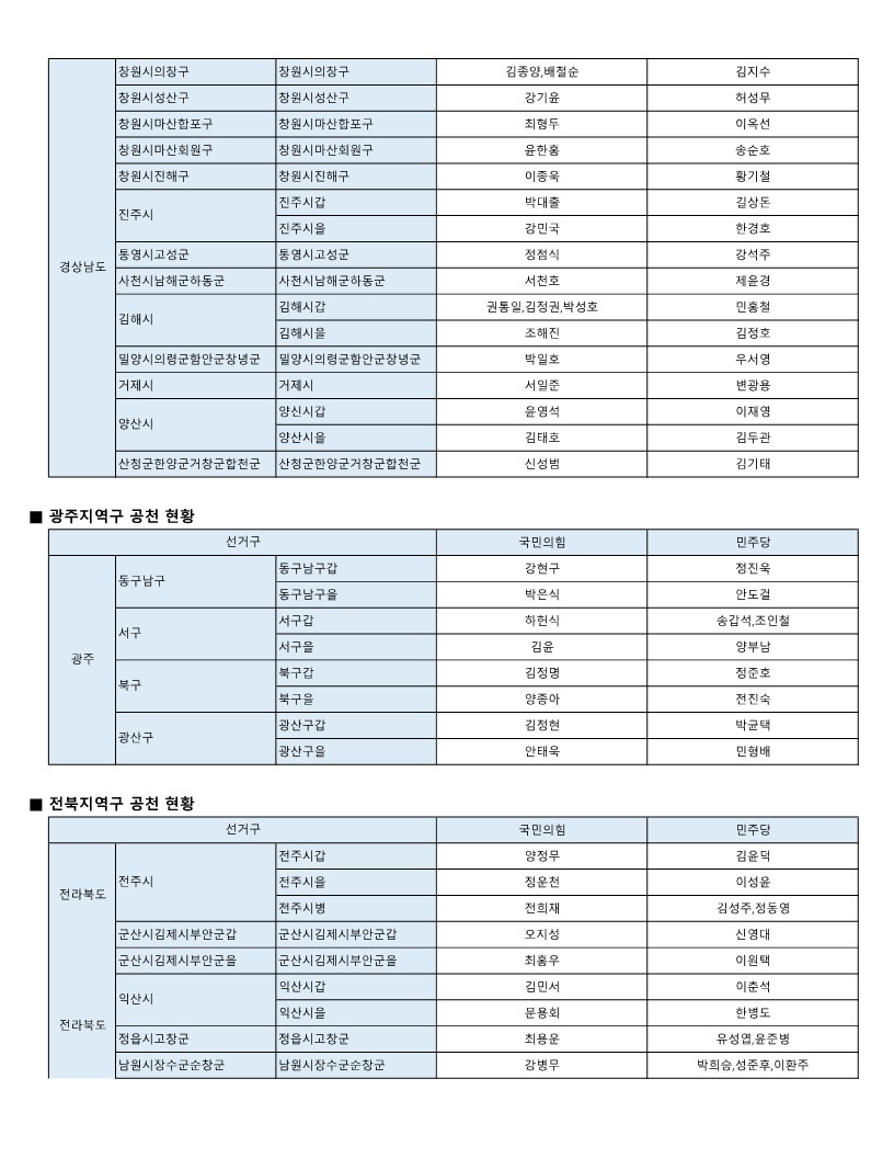 국민의힘은 3월 8일 18차 경선 결과까지 발표를 했고, 민주당 3월 8일까지 전략선거구 경선 결과를 발표했다. 선거구 확정안에 따라 조정한 내용이다. 선거구에 복수기재는 경선지역이다. 이제 양당 공천이 막바지에 접어들고 있다.
