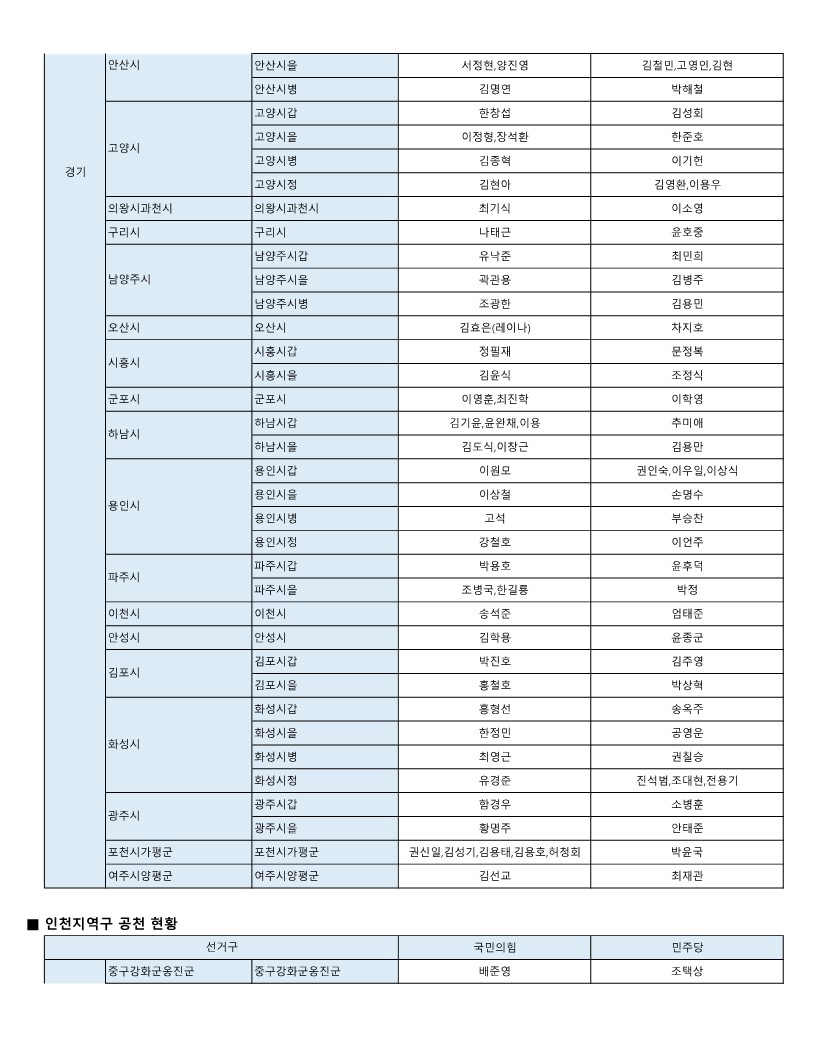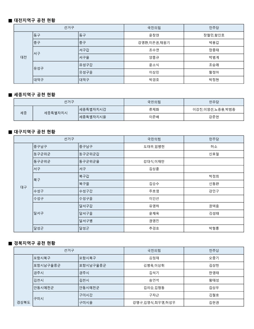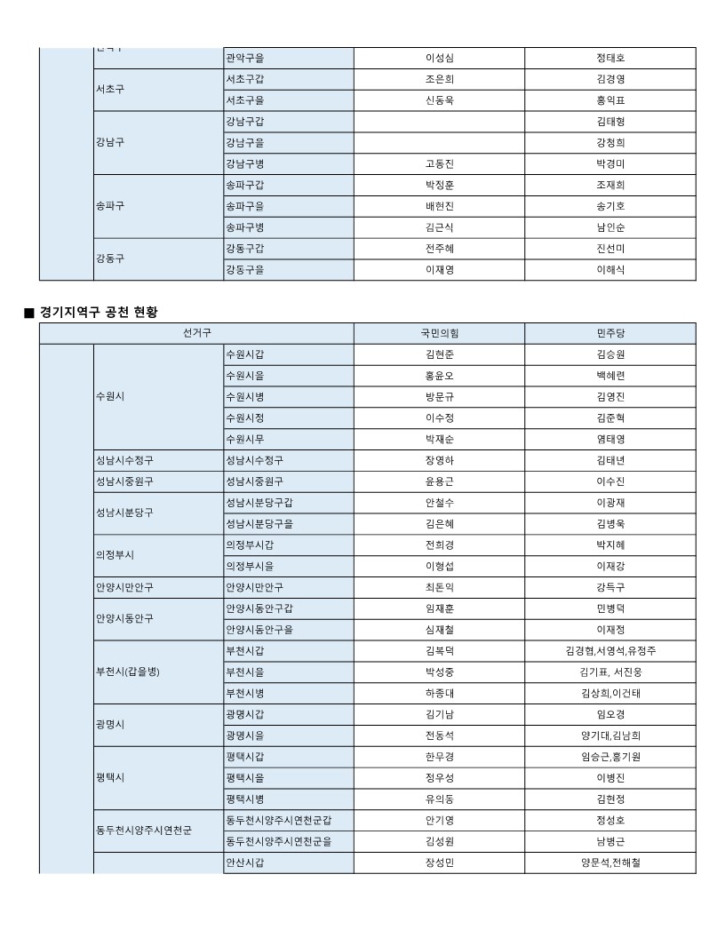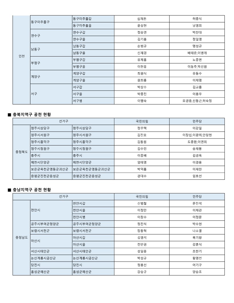 국민의힘은 3월 9일 19차, 4차 경선 결과까지 발표를 했고, 민주당 3월 9일까지 전략선거구 경선결과 발표를 했다. 선거구 확정안에 따라 조정한 내용이다. 선거구에 복수기재는 경선지역이다. 이제 양당 공천이 막바지에 접어들고 있다.