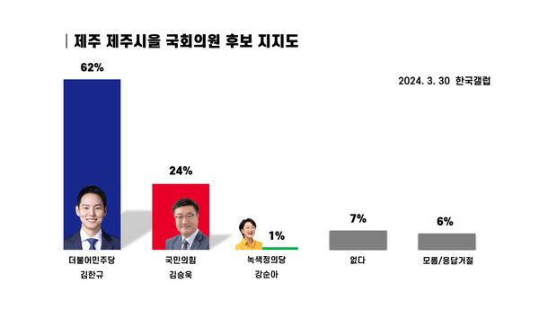 최근 조사 결과도 마찬가지다. 뉴제주일보‧한라일보‧헤드라인제주‧KCTV제주방송이 한국갤럽에 의뢰해 3월 30일 제주시을 선거구에 거주하는 만18세 이상 남녀 510명을 대상으로 무선전화 면접조사를 실시한 결과, 더불어민주당 김한규 후보가 지지율 62%로 24%를 얻은 국민의힘 김승욱 후보를 오차범위 밖인 38%p 차로 크게 앞섰다. 녹색정의당 강순아 후보는 1%. ‘없음’ 7%, ‘모름/응답거절’ 6%였다.