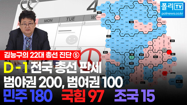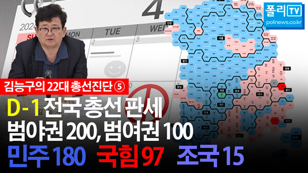 - [폴리TV][김능구의 22대 총선진단⑤] D-1 전국 총선 판세.. 범야권 200, 범여권 100, 민주 180・국힘 97・조국 15