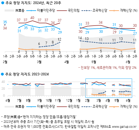 더불어민주당 27%는 현 정부들어 최저치다. 이재명 대표의 대북송금 기소 등과 관련된 것으로 보인다.