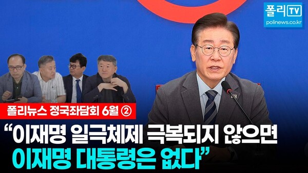 [폴리뉴스 전희재 기자] <폴리뉴스>와 월간 <폴리피플>은 24일 진행한 ‘6월 정국좌담회’에서 이재명 민주당 당대표 연임에 대해 대담을 나누었다. 김능구 폴리뉴스 대표의 사회로 서울 여의도 폴리뉴스 사무실에서 진행된 좌담회는 홍형식 한길리서치 소장, 차재원 부산가톨릭대학교 특임교수, 황장수 미래경영연구소장이 함께 했다.
