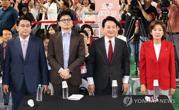 특히 국민의힘 지지층에서는 한 후보의 지지율이 22.5%p나 껑충 뛰어오른 66.4%로 압도적이었다. 원 후보는 15.2%, 나 후보 7.5%, 윤 후보 6%로 집계됐다.