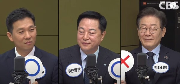 ‘O, X 퀴즈’ 코너에서 ‘민주당을 지칭하는 일극체제라는 용어’에 대해 이재명 후보는 ‘나는 도저히 동의할 수 없다’는 뜻의 ‘X’ 팻말을, 김두관·김지수는 “일부 공감한다”는 뜻의 ‘O’ 팻말을 들었다.
