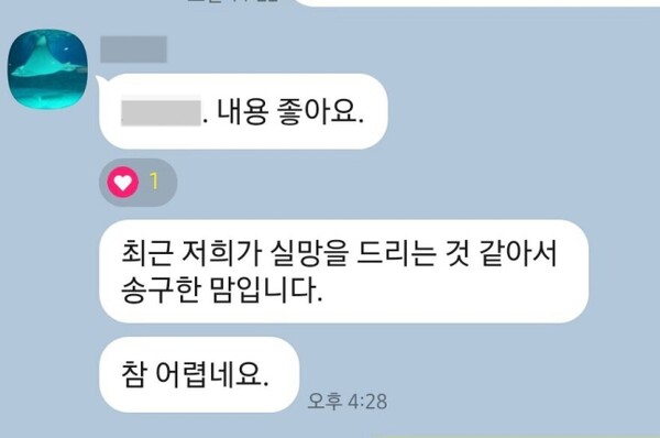 해당 대화를 살펴보면 A 국장은 "최근 저희가 실망을 드리는 것 같아 송구하다. 심리적으로 힘들다"고 했고, 지인은 "조금만 참으세요"라고 위로한다.